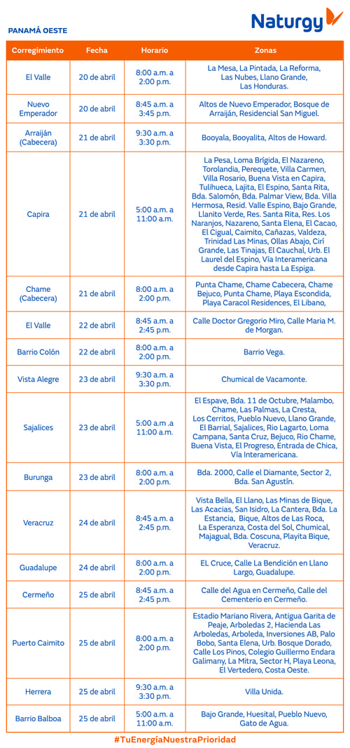 Atención Panamá Oeste. Trabajos de mantenimiento en la red eléctrica del 13 al 19 de abril de 2026 9 de abril de 2026