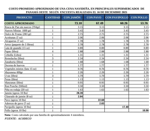 El costo de la tradicional cena navideña continúa representando un reto para muchas familias en Panamá Oeste, de acuerdo con un informe realizado el 16 de diciembre de 2025 en los principales supermercados de la región.
