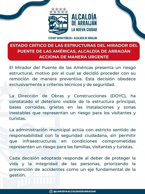 La Alcaldía de Arraiján declaró en estado crítico las estructuras del Mirador del Puente de las Américas, luego de que evaluaciones técnicas confirmaran un riesgo significativo para la seguridad de los visitantes. Ante esta situación, las autoridades municipales decidieron proceder con su remoción de manera preventiva.