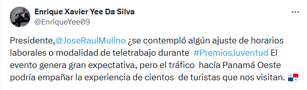 Usuarios habituales de la vía Interamericana expresan su preocupación ante una posible afectación en el tráfico hacia Panamá Oeste, debido a la realización de los Premios Juventud 2025, que se celebrará este jueves en la ciudad capital.
